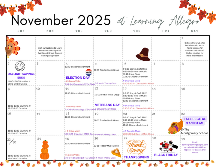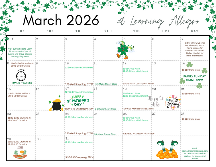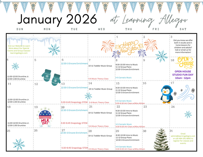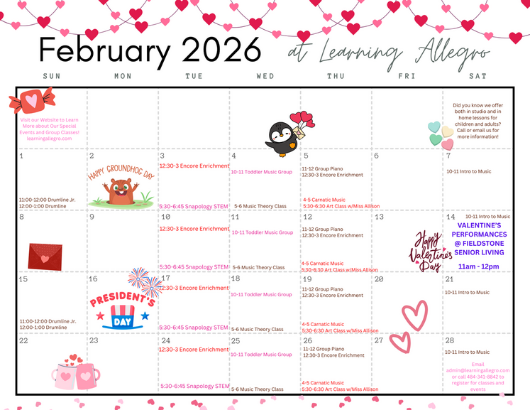 Learning Allegro takes a whole-child approach to music education. Teachers design lessons and group classes to meet the intellectual, social, behavioral, and emotional needs of each and every student. We believe a strong foundation of technique mixed with a little fun will help each student reach their full music potential!