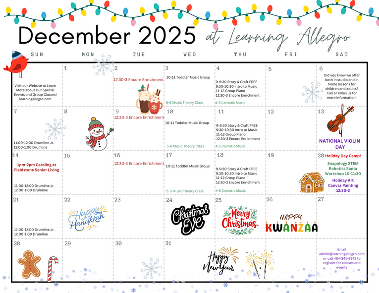 Learning Allegro takes a whole-child approach to music education. Teachers design lessons and group classes to meet the intellectual, social, behavioral, and emotional needs of each and every student. We believe a strong foundation of technique mixed with a little fun will help each student reach their full music potential!